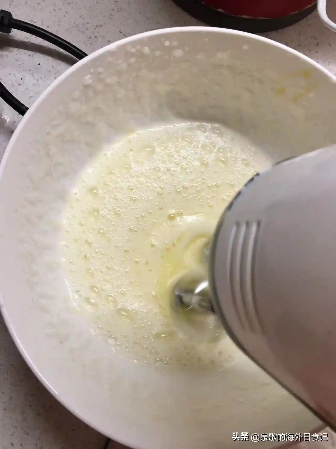 用手动或电动打蛋器的中低速,朝一个方向(顺时针或是逆时针打发[泣不成声]不要一会儿顺时针一会儿逆时针,会消泡消回去的。打发的过程中,分三次加入各15g糖:第一次是上图这种出现大气泡,整个蛋清的颜色还是原始的黄白色的时候。