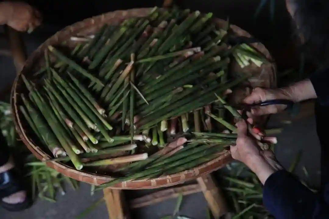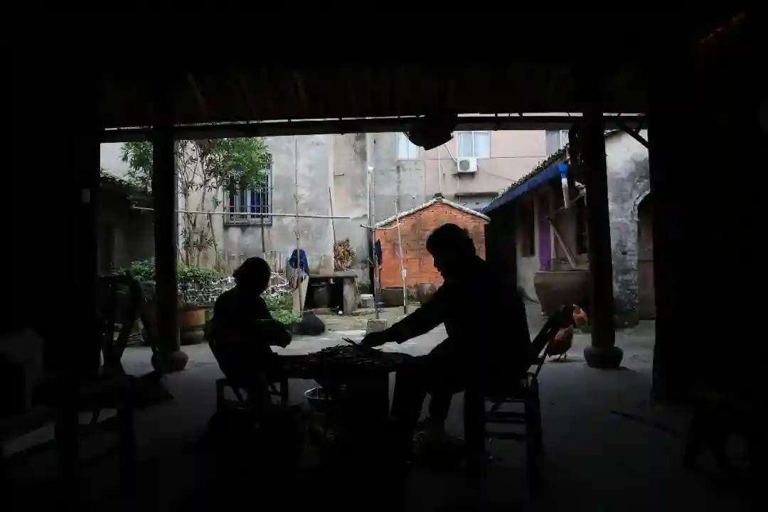老人在屋檐下悠闲地剥笋壳,