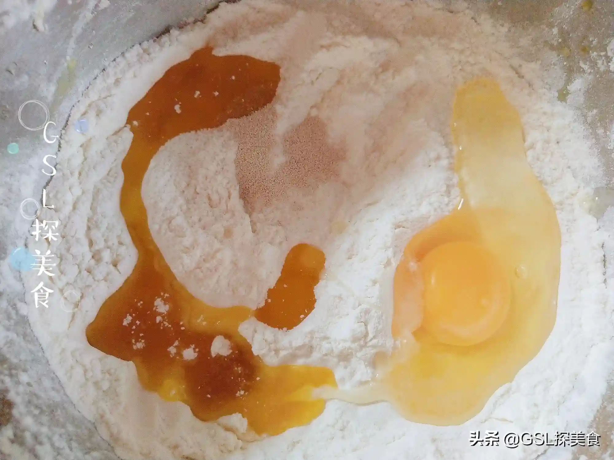 第1步,先准备一个和面盆,把面粉倒进去,加入酵母,食用油,鸡蛋和白糖,稍微搅拌均匀,再往里面加入牛奶,搅拌成絮状,揉成一个面团,面团一定要偏软。