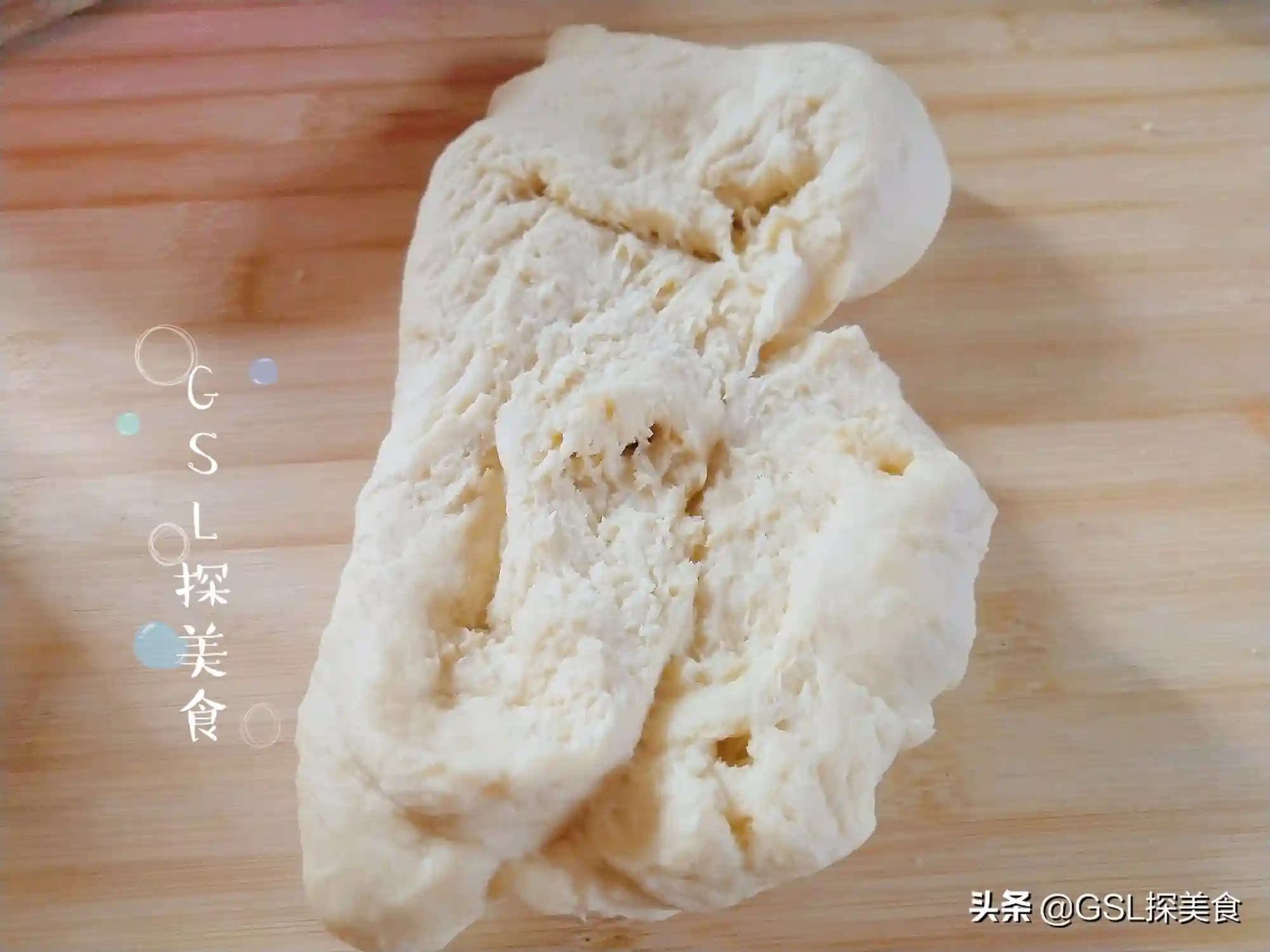 第2步,接下来就是揉面了,最初揉成团的面团,放在案板上,用手像搓衣服似的,来回搓,不停地变换方向搓,一定要搓开。