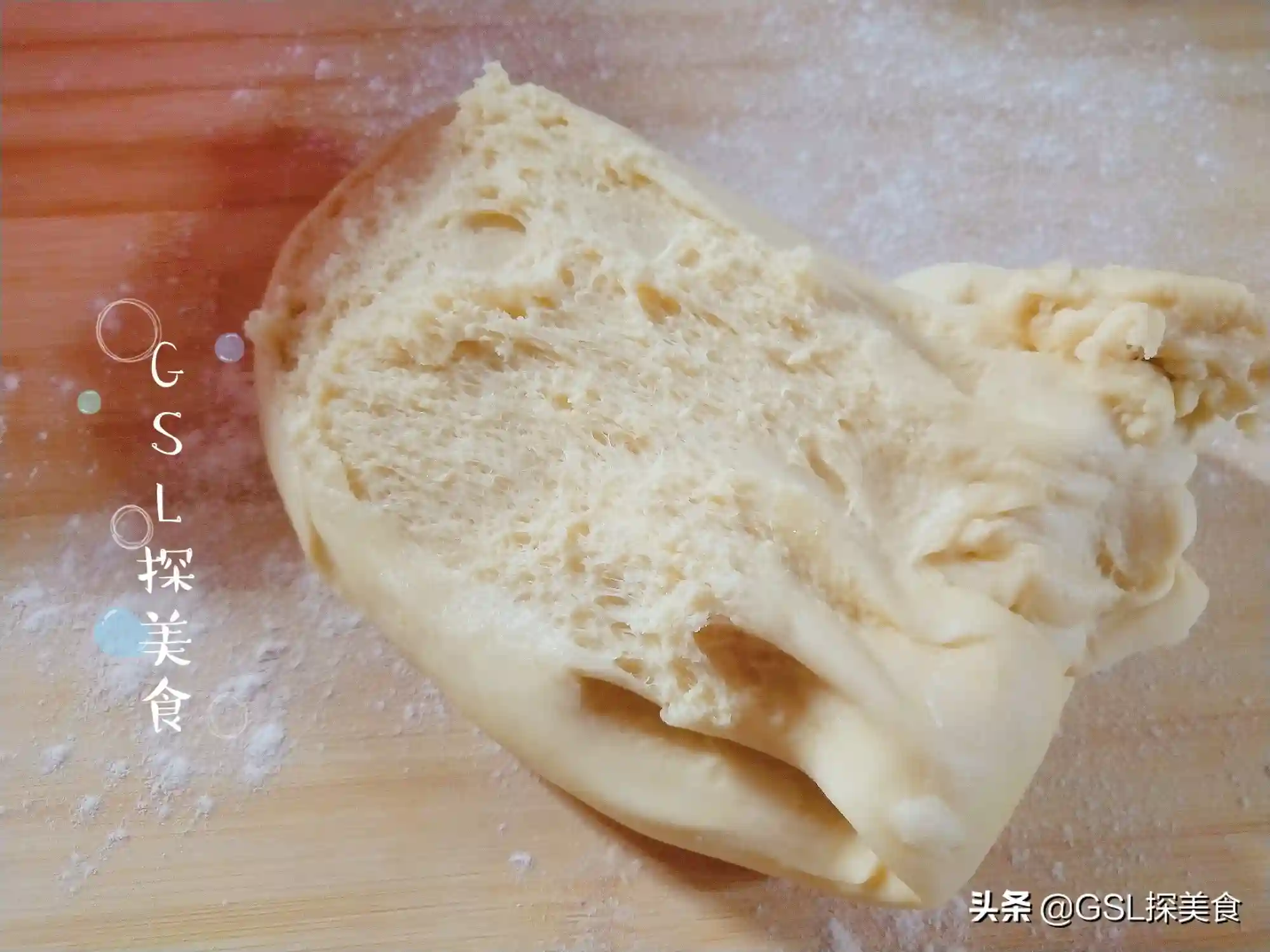第3步,面团揉好之后,放在面盆中,盖上保鲜膜放在温暖的地方,醒发至两倍大,这是醒发好的状态。