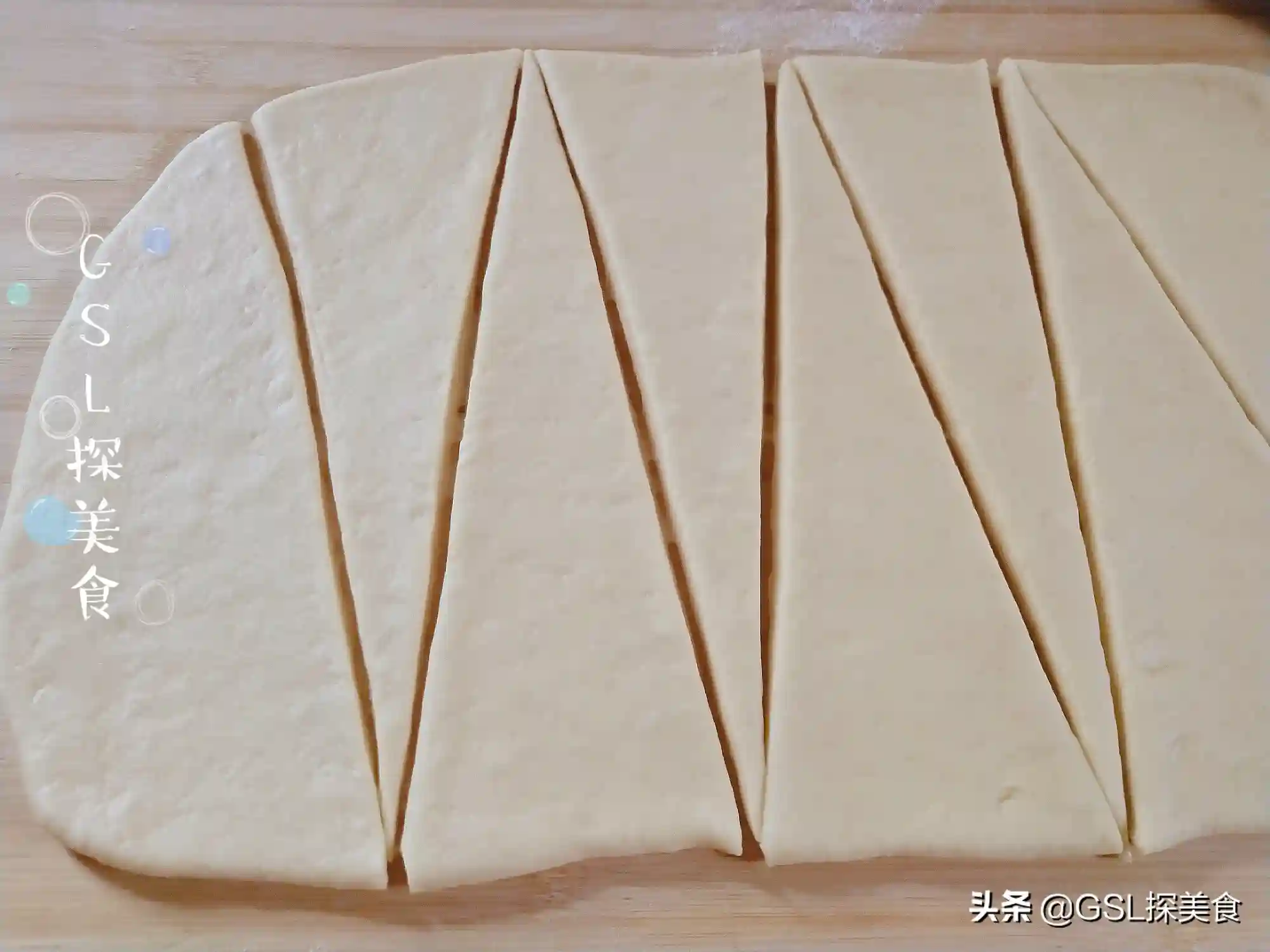 第4步,把醒发好的面团,放在案板上,稍微撒点干面粉防粘,揉搓排气,接着就把饼擀成长方形的饼状,然后再像图片中似的,切成三角形。