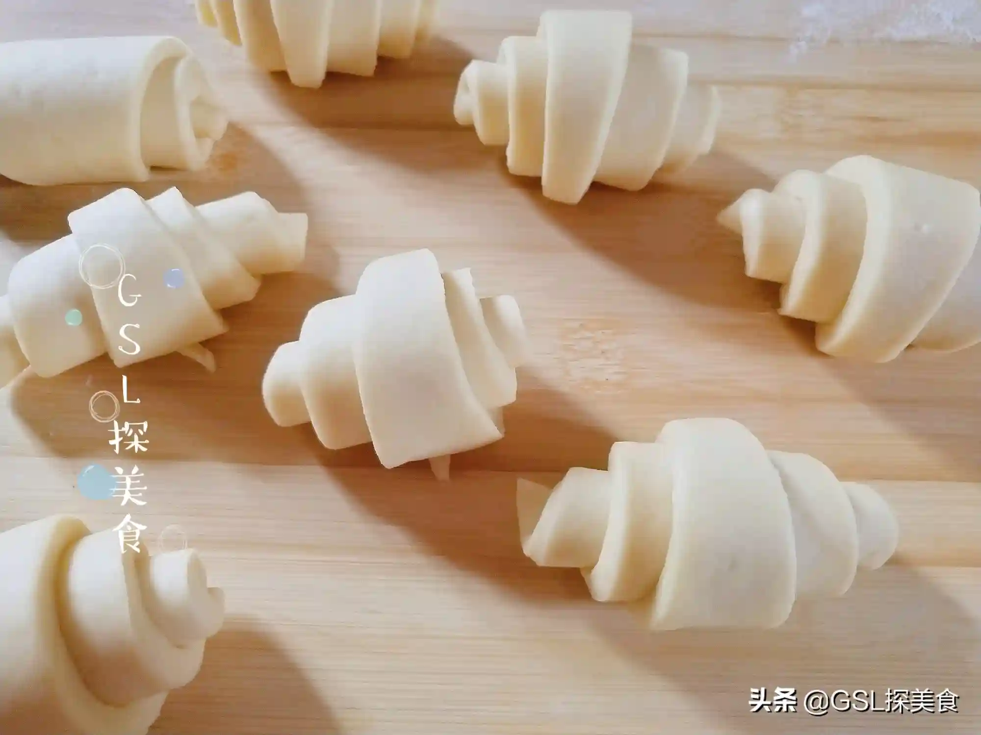 第5步,从宽的一头卷起来,卷成像牛角一样的形状,然后放在烤盘上,盖上保鲜膜二次醒发至1.5倍大。