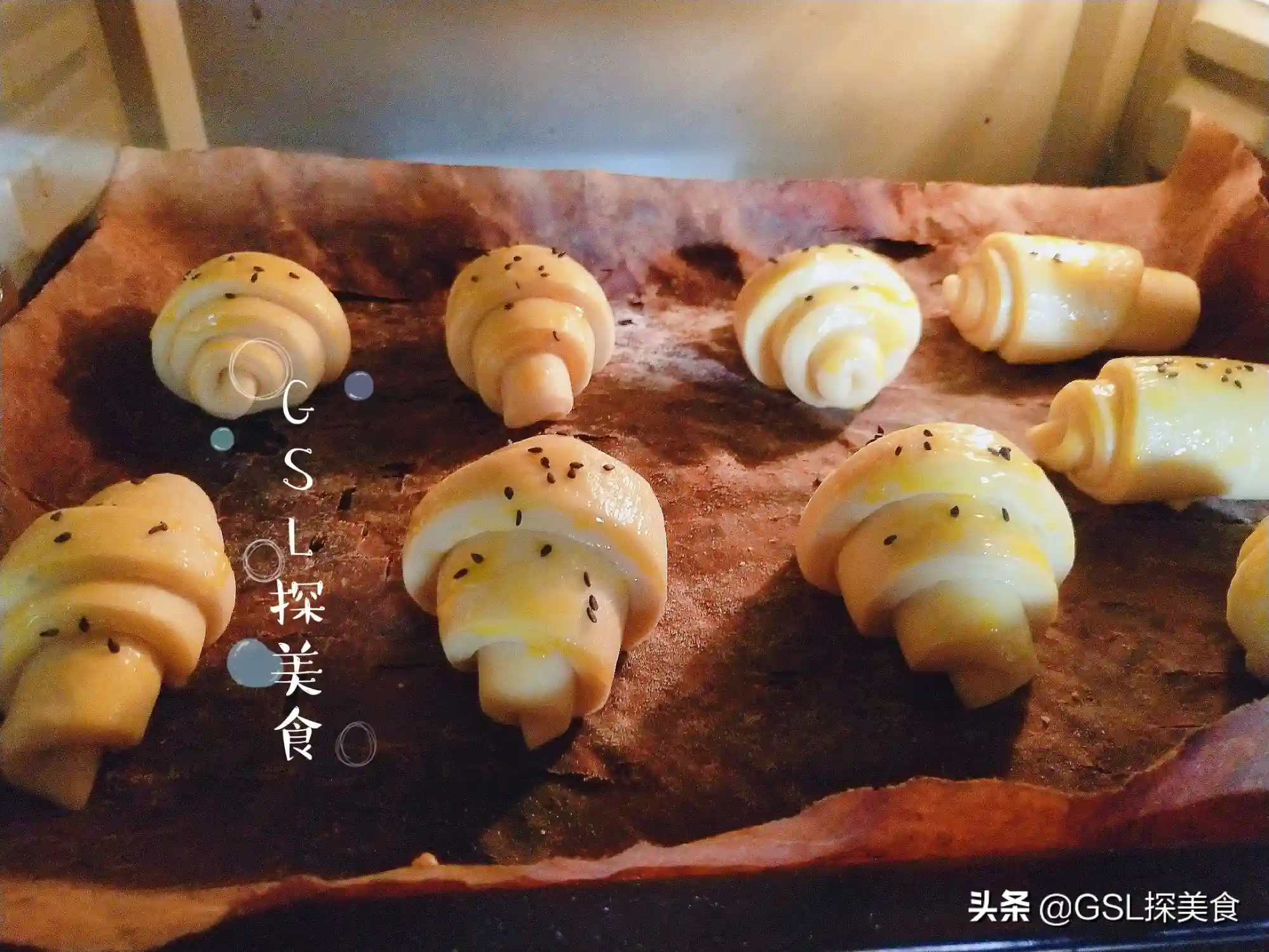 第6步,醒发好了之后,取一个蛋黄在牛角面包的表面刷上一层蛋黄液,再撒上适量的黑芝麻作为点缀,然后放进预热好的烤箱中,150℃,烤20分钟。