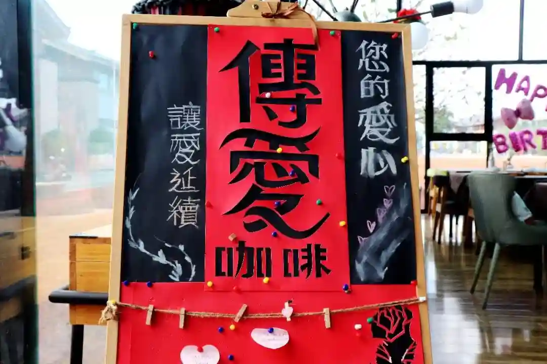 "传爱咖啡"是杨大哥烘焙店门口的一道风景。