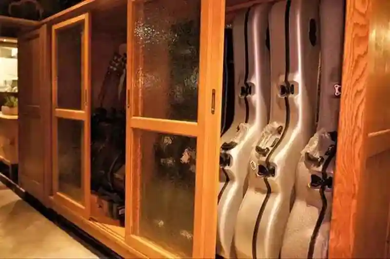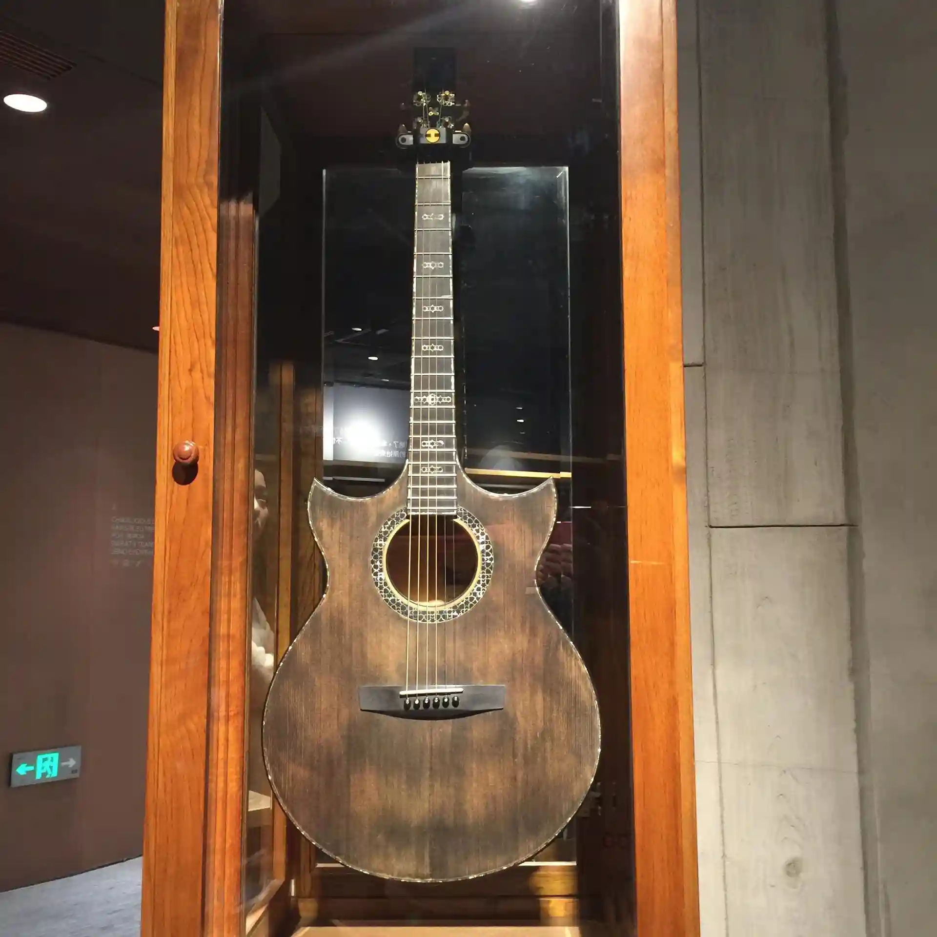 咖啡馆里有一个区域摆着几个高大的展示柜,里面躺着大哥收藏的几把有历史的吉他,在识货的收藏家把他们买走前,赶紧去看两眼吧。