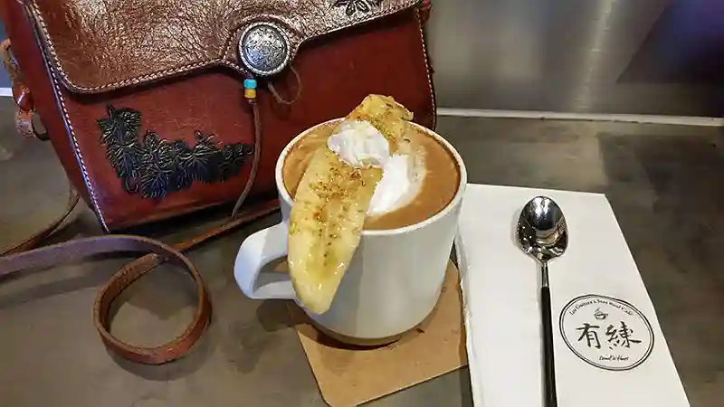 最终还是点了一杯元气香蕉咖啡,先把香蕉吃掉,把奶油搅拌入咖啡,口感棉滑,刚刚的香蕉味儿还留在口中,和咖啡的邂逅刚刚好。价格为58元。