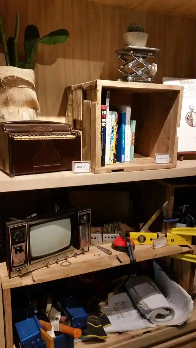 进店,扑鼻的咖啡香气飘来,咖啡店分为两层,一层以吧台为主,错落着几张高脚圆桌,有一个“老物件儿”的展示区域,旧电视机、喝水的缸子、和一切带你回到七八十年代的那些个玩意儿。