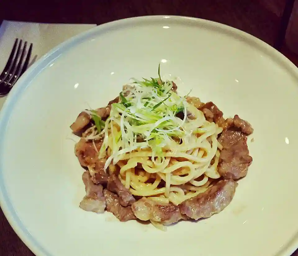 金沙豆腐乳松阪猪意大利面,虽然名字稍微拗口,但是把这几样搭配在一起还是很富有创意的,量不大,面被酱包裹的很牢,口感浓厚,猪肉也很鲜嫩。价格为78元。