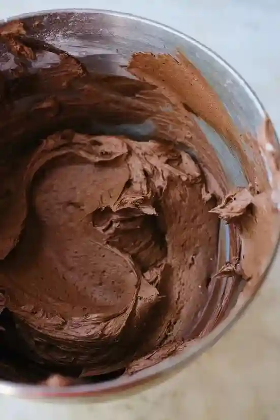 1.将无盐黄油倒入搅拌桶中,用中速打发至奶油状。2.加入糖粉、可可粉、牛奶、盐和杏仁精,用橡皮刮刀将所有原料搅拌均匀。3.用打蛋器中速搅拌一分钟左右。