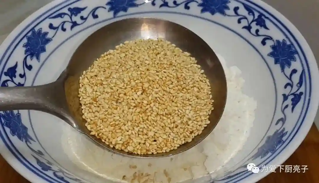 这里准备的是普通小麦面粉,芝麻里面选用的熟芝麻,外皮选用的是生芝麻。