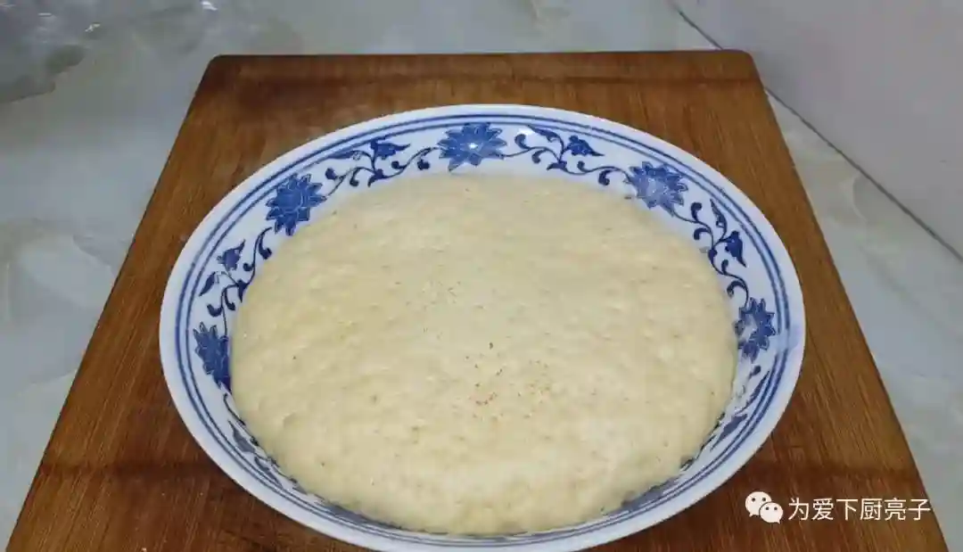 发酵一小时以后,面团去除保鲜膜,面团成很多小蜂窝状。
