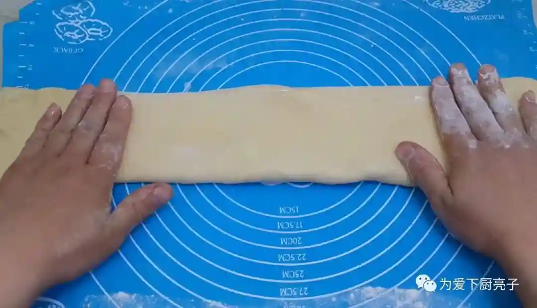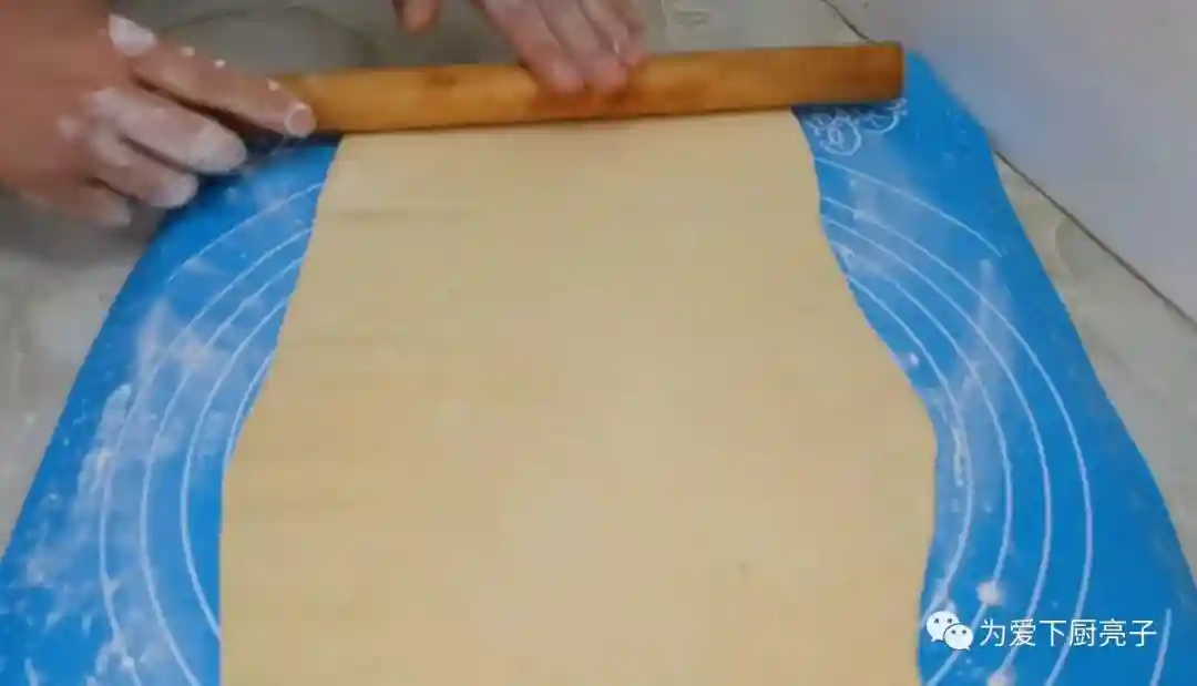 面团擀杖按压一下,擀成一张薄薄的长方形大饼。