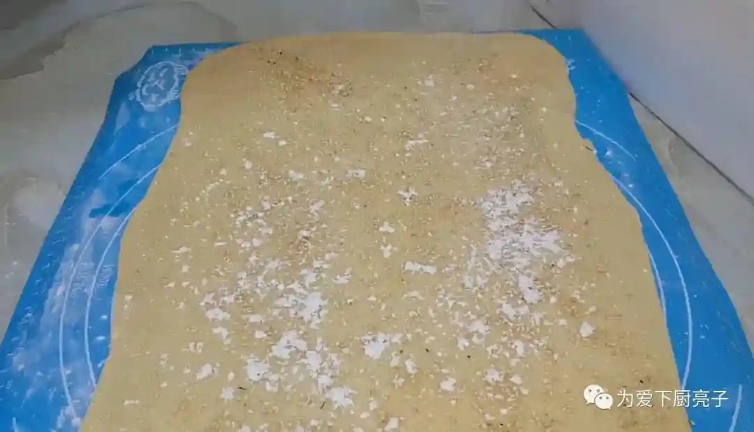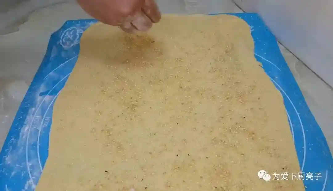 烙饼先刷一层熟油,再撒上少许熟芝麻,撒上少许小麦面粉。