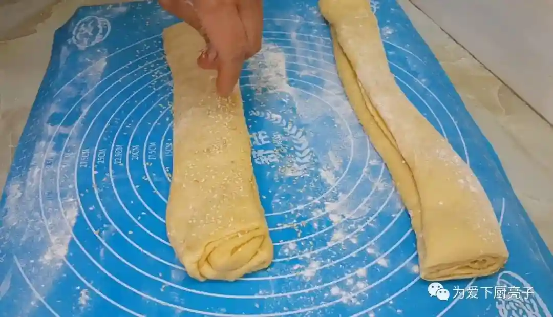 面饼两边对折一下,重复一次操作,撒上芝麻和面粉等等。