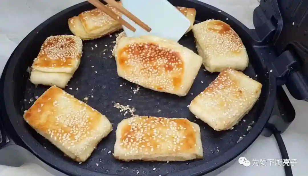 热锅刷少许凉油,放入芝麻千层酥饼,放入自制烙饼。