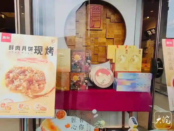 大皖新闻记者来到位于合肥繁华大道的一家糕点店,橱窗里展示出了花样繁多的月饼,店门前还摆放着标有“鲜肉月饼现烤”字样的海报。