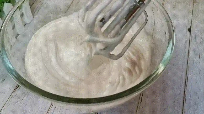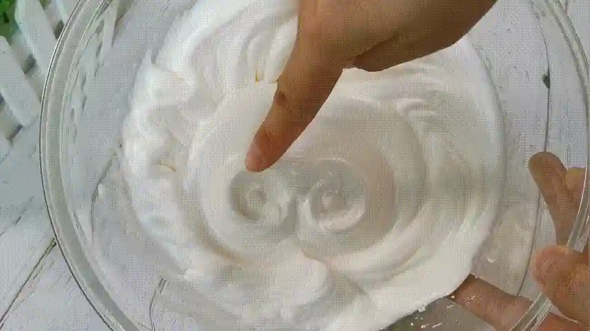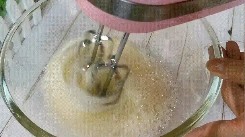第十五步:当蛋白霜打发至提起有小尖勾,或者观察碗中有鱼眼状就说明打好了。