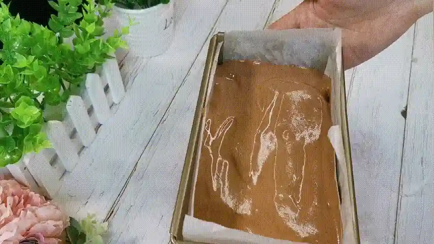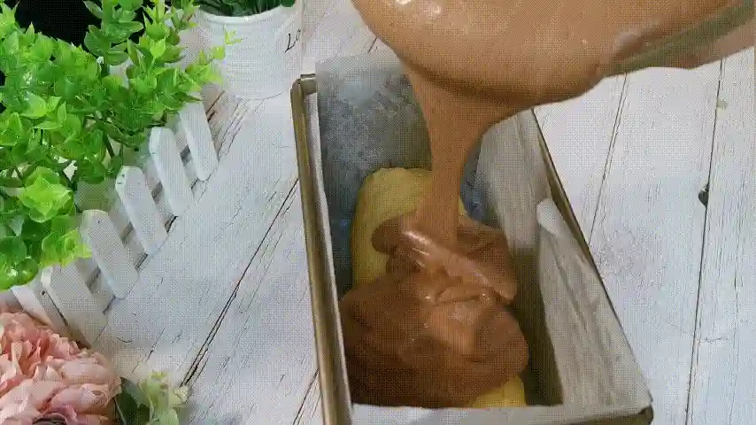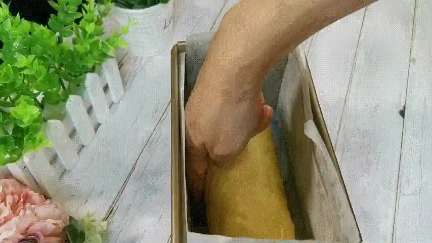 第十八步:这时候面包基本也发酵好了,面包卷不需要发酵的太大,两边要留一指宽的距离。然后将蛋糕糊倒入吐司盒中,再用刮刀将表面处理平整。