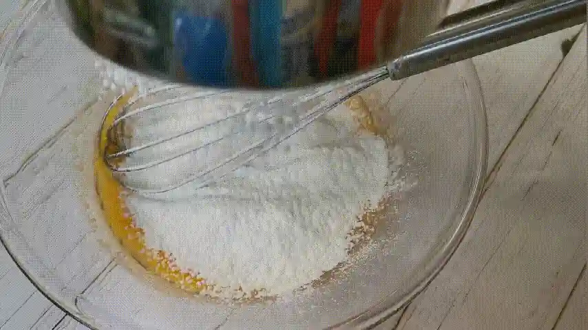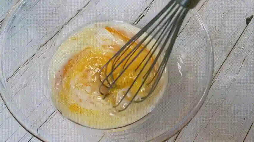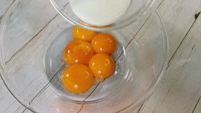 第十二步:5个蛋黄里先倒入牛奶和玉米油,再用搅拌棒搅拌均匀。