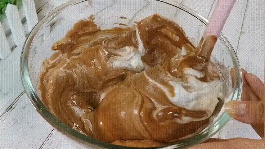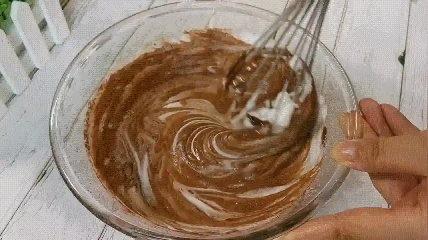 第十七步:将混合好的可可糊倒入剩下的蛋白霜中翻拌均匀,这一步一定要快,因为可可糊会让蛋白霜迅速的消泡。