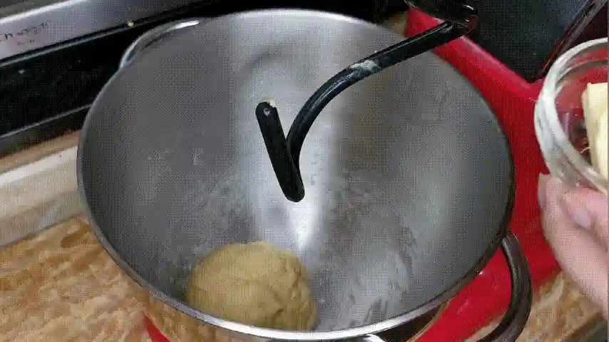 第二步:等待面团肉至光滑以后,我们加入盐和黄油,同样先开低速将黄油揉进去后,再开中速来揉面。