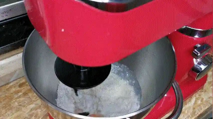 第一步:将除黄油和盐以外的所有材料倒入揉面缸中。开启厨师机,先开低速将所有材料混合均匀,再开中速来揉面。