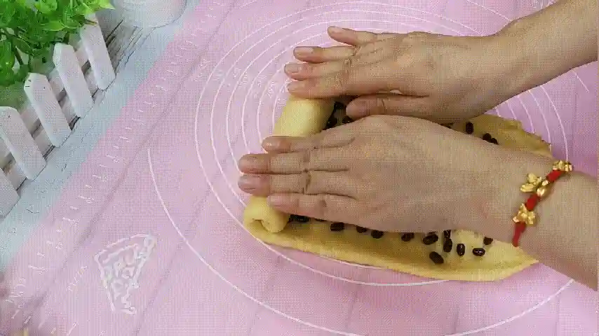 第十步:红豆铺均匀以后,卷成一个面包卷,吐司盒中我们要铺好油纸,将面包卷放在吐司盒的中部,继续发酵,这次不用发酵的太大,1.5倍大就可以。