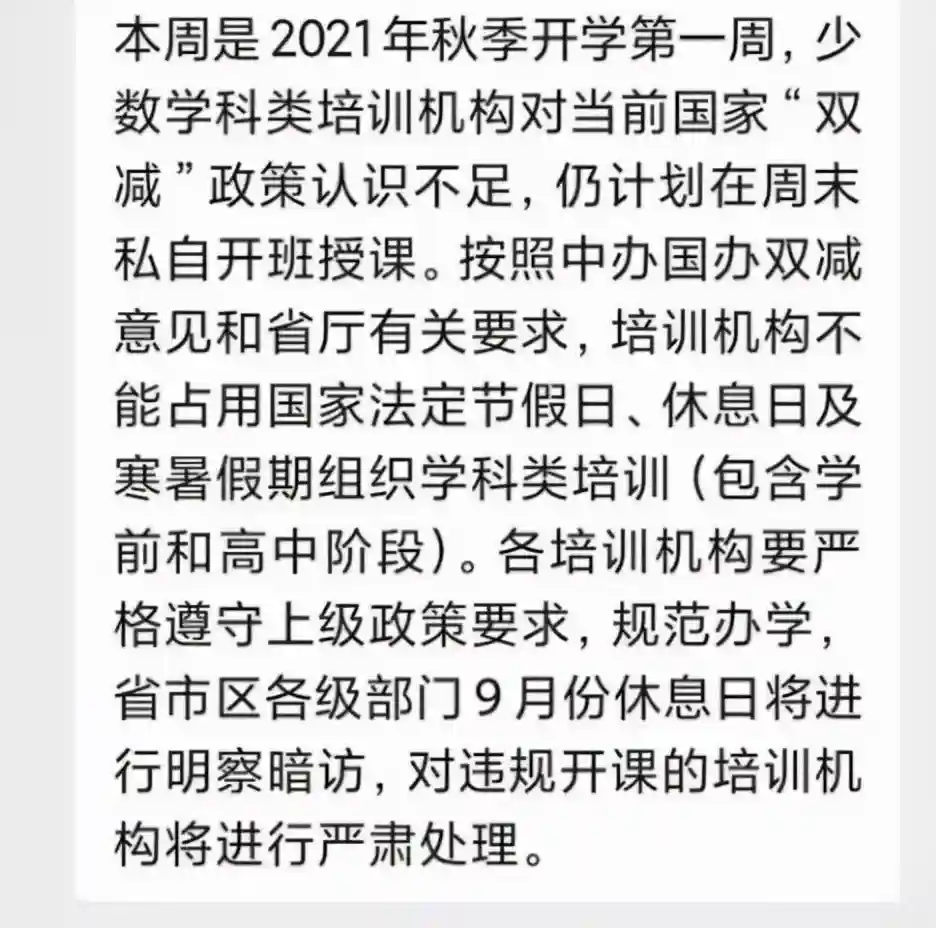 仔细解读政策后发现,教育部严查周末开课,而周中补课不在监管范围内,于是各个补习机构开始发布调课通知,将周末课程安排在周中。