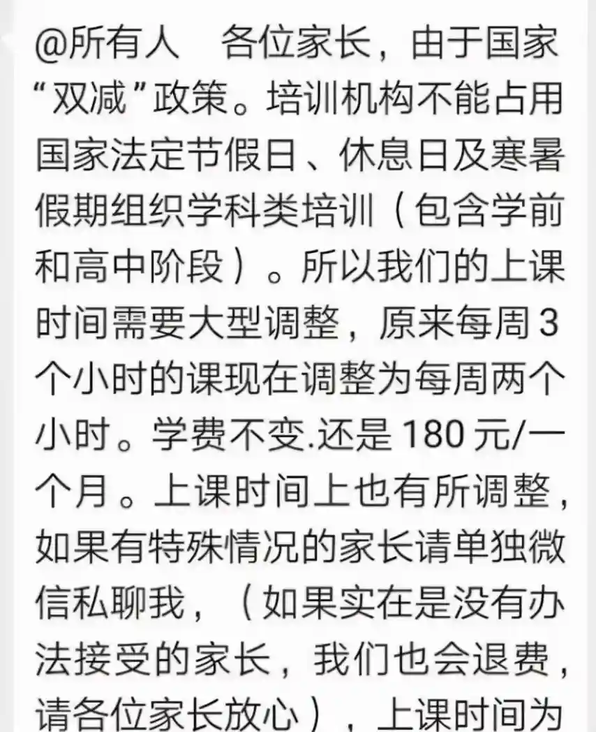 针对此问题,小郭老师所在的补习机构负责人表示,虽然上课时间被压缩了,但学费不会变,如果有家长不想补习了,可以联系负责人进行退费。