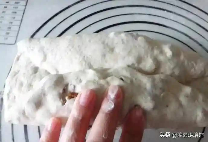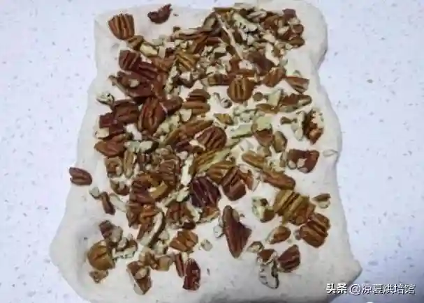 Step3:将面团拍扁之后,将切碎的碧根果均匀放在上面反复折叠,让核桃仁均匀分布