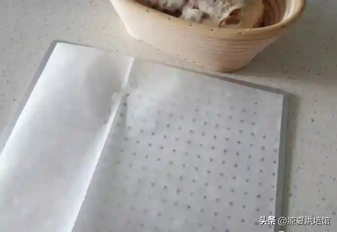Step11:转移板加垫油纸,藤篮倒扣,发酵完成的面团转移完成