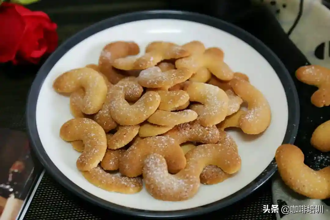 香草新月小饼干宛若弯弯的新月,沾裹着糖粉,香酥可口。搭配中度烘焙的奶咖,似苦还甜,与咖啡相互融合,感受香草纯正浓郁的风味,在口中留下浓醇的余味。