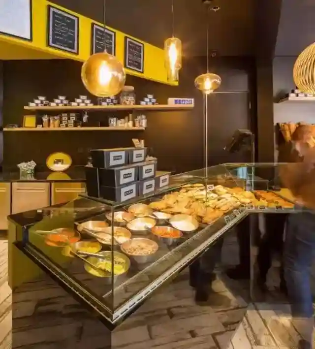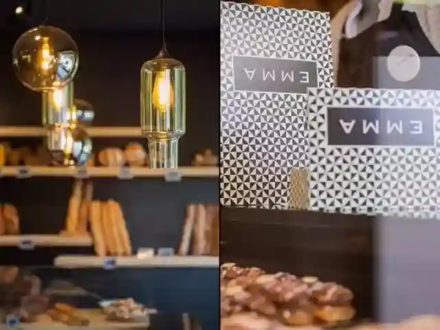 法国Emma甜点面包店的面积很小,黑色的墙面、天花板和柜台,搭配时尚的灯具照明、几抹鲜艳的色彩,小而酷的面包店就从典型、通俗的面包店中脱颖而出,大型的透明玻璃窗户将室内的采光最大化,路过的人也能清晰的看见Emma精心制作的糕点。