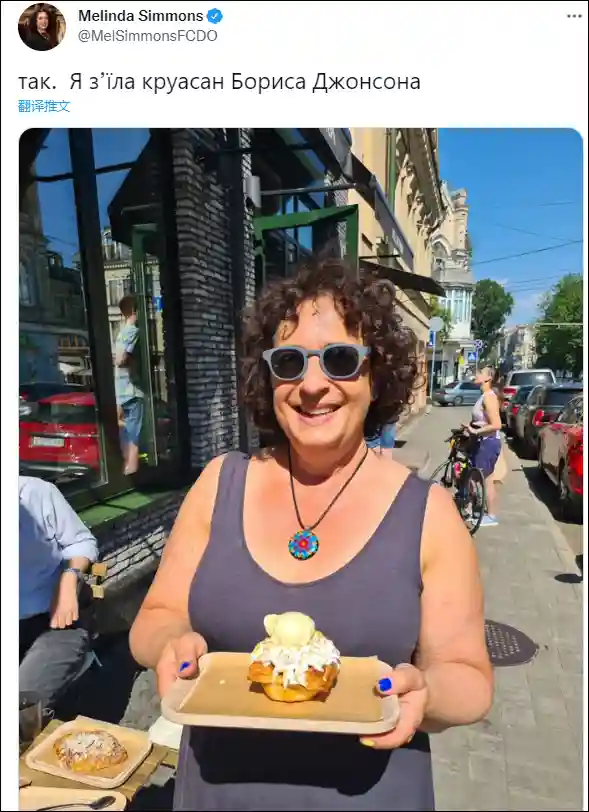 英国驻乌克兰大使梅琳达·西蒙斯也在个人社交媒体上晒了一张自己购买约翰逊羊角面包的图片。