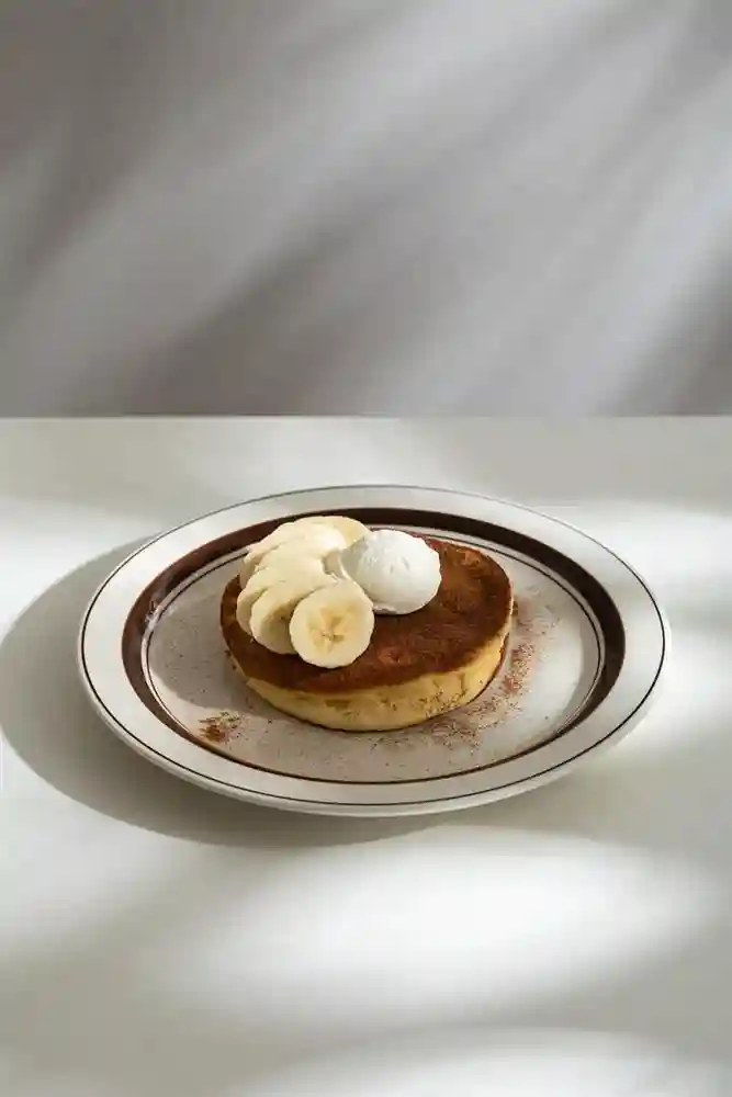 10将步骤8烤好的舒芙蕾松饼装盘,撒上肉桂粉之后放上香蕉和鲜奶油做装饰。