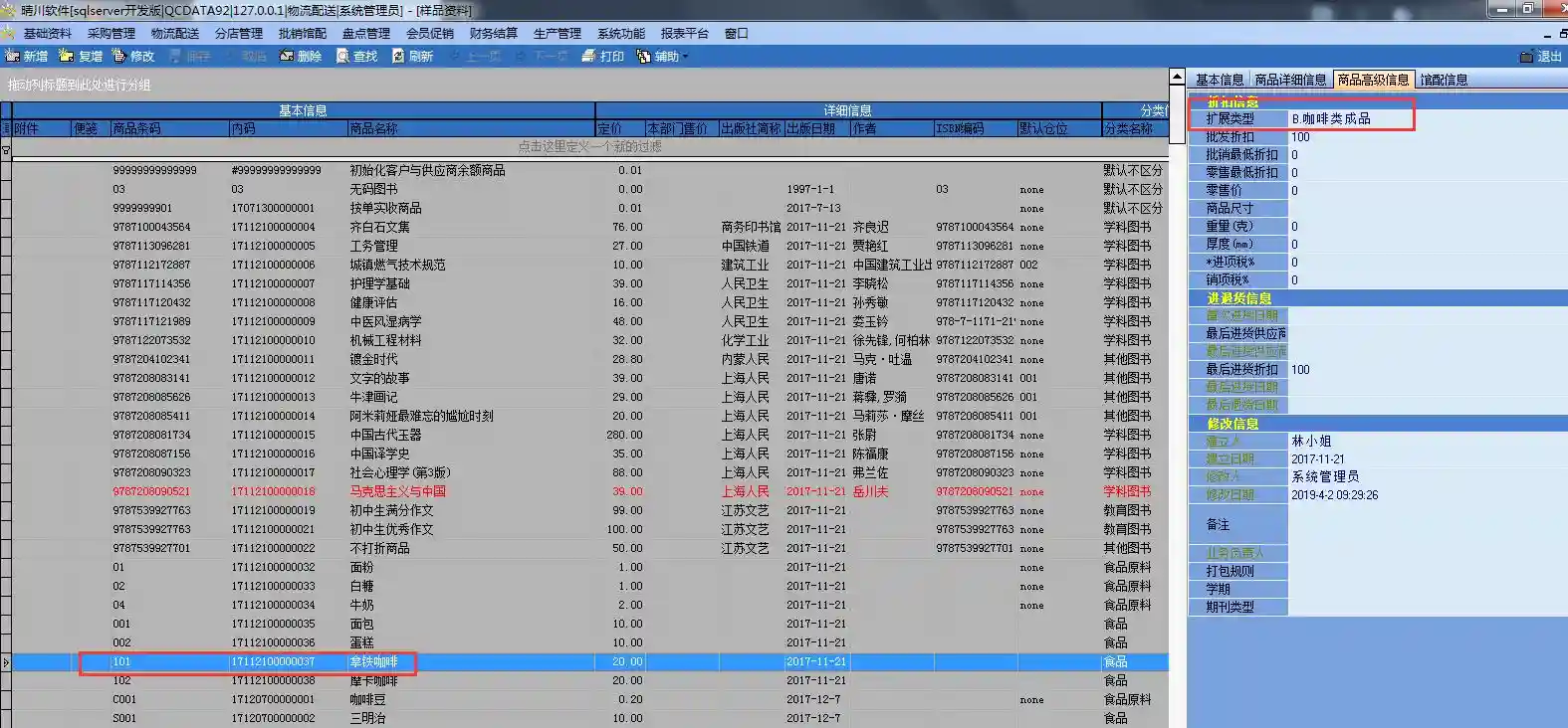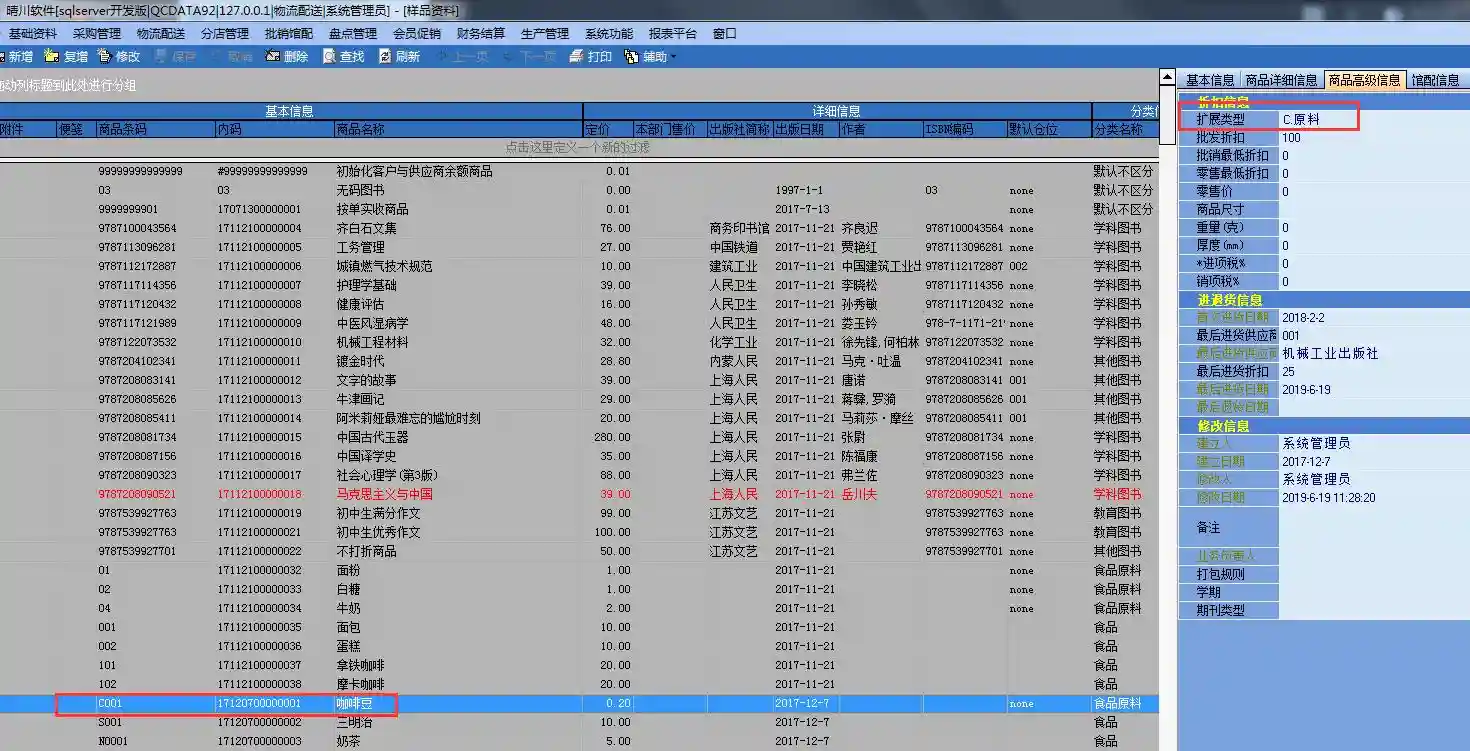 商品资料——建立原料的商品信息(类似于咖啡豆,在建立的时候,需要在商品高级信息,里面选择C、原料)
