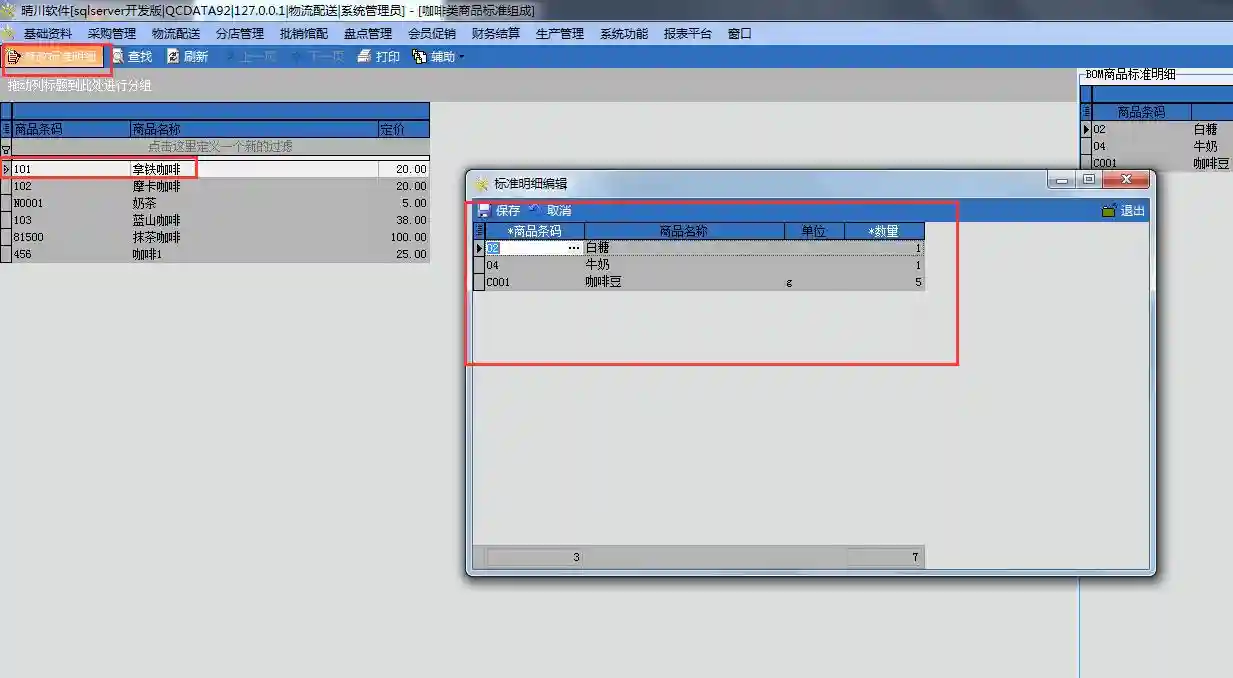 基础数据——基本资料扩展——咖啡类商品标准组成——选择成品咖啡——修改标准明细——添加原料组成配方——保存。
