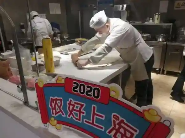 通过全透明的玻璃,可以看到后厨里正在忙碌地擀皮子。