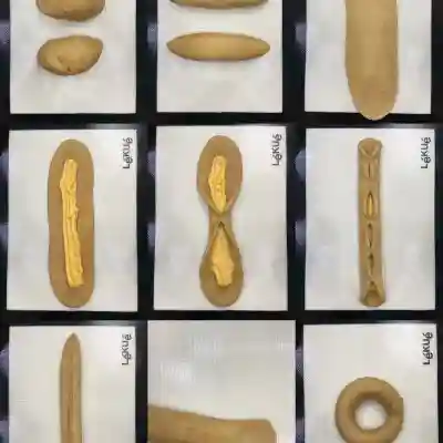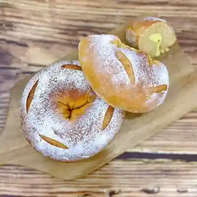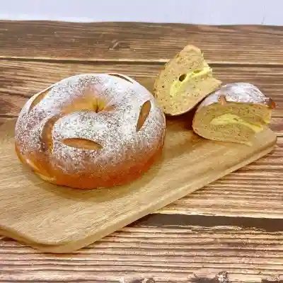 4、发酵好的面团分割成2份,整成椭圆形,盖上保鲜膜松弛30分钟;取松弛好的面团,擀成长条形,在中间挤上一半的馅料,收口捏紧;捏好的面团均匀滚长,把一端压扁,圈成圆形压在另一端面团上,收口捏紧;