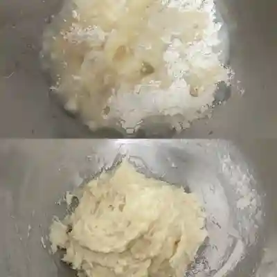 2、制作馅料:黄油+水+细砂糖+盐放入锅中加热,煮开后离火,加入低筋面粉混合均匀,再次小火加热,将面糊炒制2分钟后关火,放凉,分次加入蛋液搅拌均匀,制作好的面糊装入裱花袋备用;