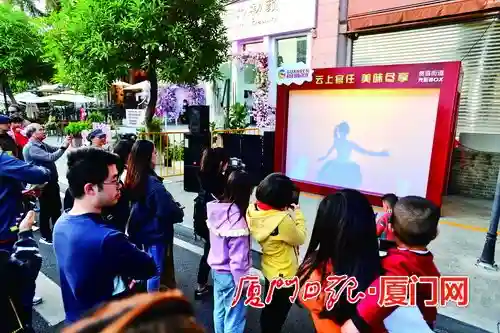 为期半个月的活动,也意外造就了筼筜湖畔一处新的网红打卡点——一个神秘而又富有趣味的“光影互动盒子”,利用光影错位,加上道具辅助,人走进这个“盒子”里,可以凹出各种造型,拍出各种意想不到的剪影照片。2020年12月26日下午,“云上官任美味尽享”活动在管人商圈咖啡一条街启幕,在弦乐四重奏的悠扬乐曲声中,一位芭蕾舞舞者就在这个“盒子”里,为大家带来别具特色的光影芭蕾舞表演。随后,市民朋友纷纷排队尝鲜,其中不乏不厌其烦、一次又一次给小孙子拍摄各种场景的老爷爷,还有来自“小红书”等平台的网络达人美少女,也有每周都会到咖啡一条街散步的阿姨,以及附近写字楼的白领群体,他们发挥各自创意,拍出各种照片,引路人禁不住驻足观看,还主动帮忙拍照,气氛融洽。
