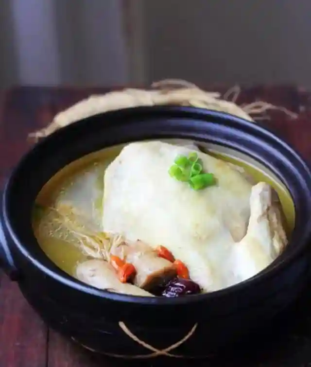 炖老鸡在锅内加二三十颗黄豆一起炖,