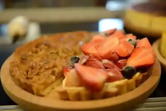 草莓塔:酥松的杏仁塔底,上面铺满了覆盆子奶油和酸甜的草莓,伴有星星点点的开心果碎,实在是太适合如此炎热的夏天。