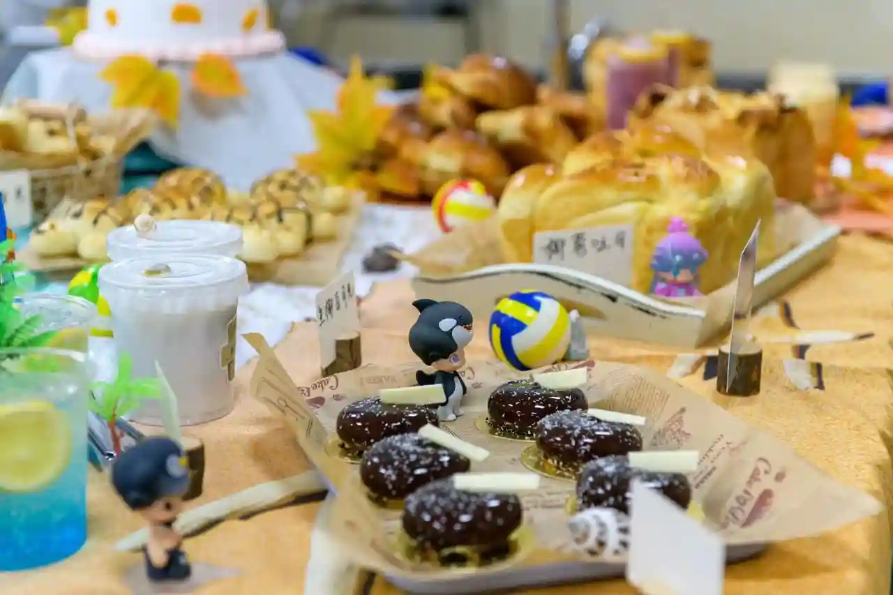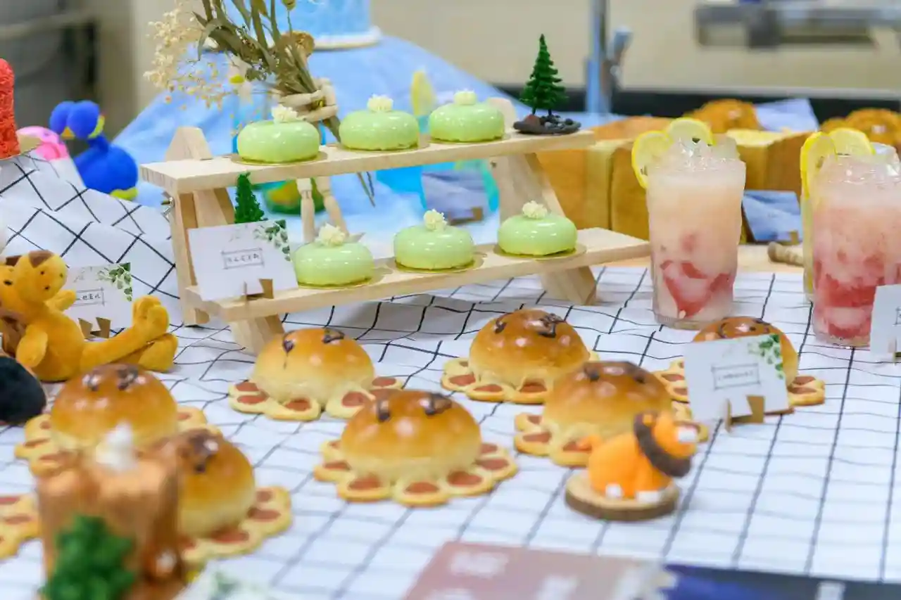 可爱的动物面包,造型新颖的创意蛋糕,还有各种口味的特色饮品,长达3米的桌子上摆着各式各样的烘焙作品。