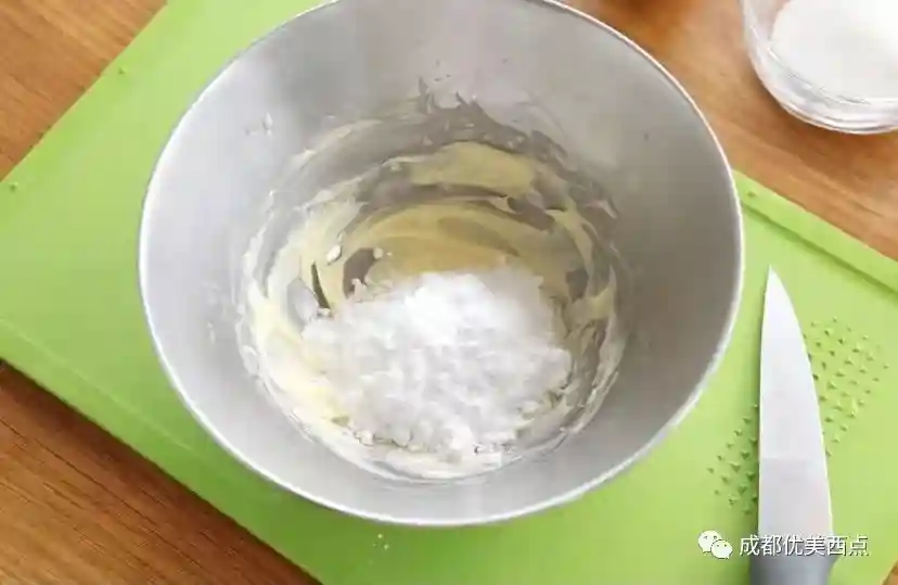 2、先制作酥皮的部分。软化后的淡味黄油,打至顺滑,放入糖粉打匀。