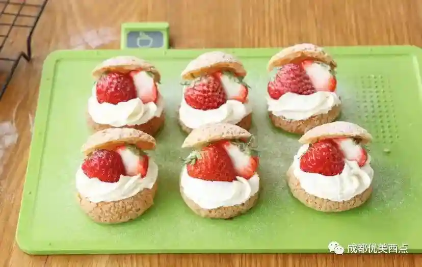 16、泡芙中间切割开,均匀挤上奶酪馅儿。草莓对半切开,插入奶酪馅中,最后撒防潮糖粉,完成。
