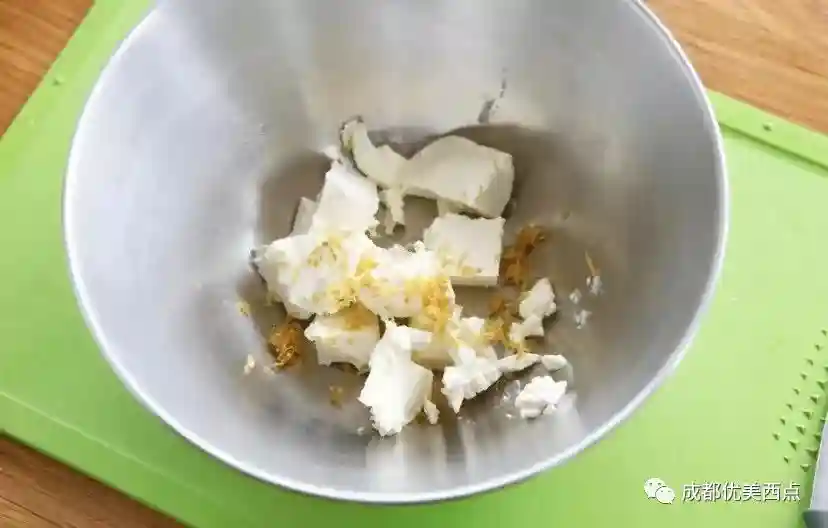 14、最后准备奶酪馅儿。奶油芝士+柠檬皮打顺滑。