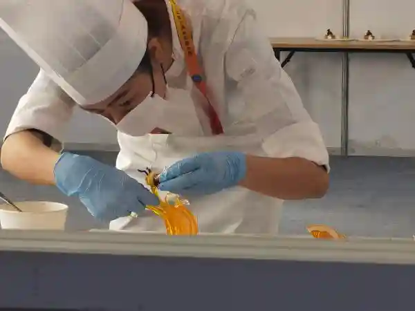 没想到到了新疆的比赛现场,由于气温比上海低很多,打完的慕斯很快会结块。她倒是很淡定,“慕斯的流动性不强了,就容易产生气孔。我有个小经验,就是现场把慕斯加热一下,很快就能解决问题。”她很骄傲,自己在比赛中完成的慕斯蛋糕作品淋面没有一点气孔,“非常完美”。