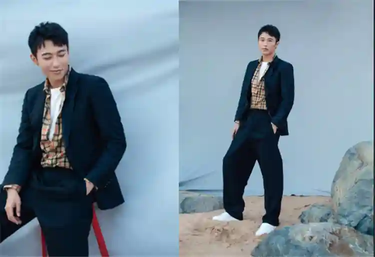 T恤叠穿Burberry衬衫,再套西装,非常具有层次感。